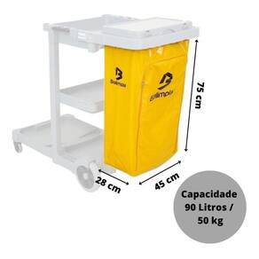 Caracteristicas: - Material: Policloreto de polivinilha, policloreto de vinil ou cloreto de vinila PVC - Dimensões: Largura 45 cm x 28 cm de Altura x 75 mm de profundidade - Capacidade: 90 litros / 50 Kg - Fácil montagem e desmontagem na Alça dos Carros Funcionais, através de Ilhóses. - Saco coletor em vinil - capacidade : 90 litros/50 Kg