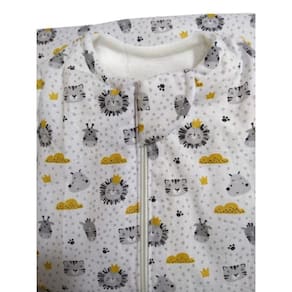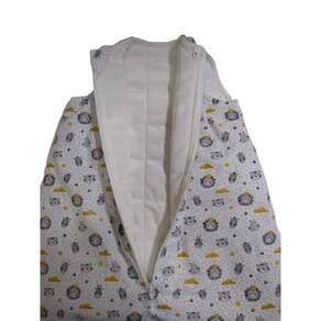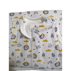 Tamanho M de 3 - 6 meses com altura dos ombros aos pés de 65 cm. Tecido externo estampado em tricoline 100% algodão.Abertura frontal com zíper e protetor de fecho localizado na gola para maior conforto do bebê.