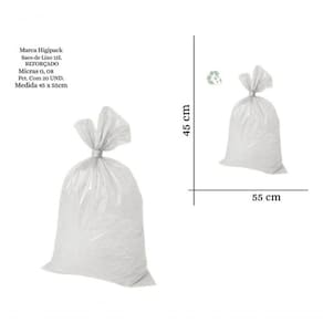 O Saco de Lixo 15L Reforçado Transparente Higipack é indicado para o descarte de resíduos médios em ambientes residenciais e comerciais. Com capacidade de 15 litros e espessura de 0,08 micras, oferece maior resistência e segurança no manuseio do lixo. As medidas aproximadas de 45 cm x 55 cm proporcionam bom encaixe em diferentes tipos de lixeiras. Pode ser utilizado em casas, condomínios, estabelecimentos e eventos que demandam praticidade no descarte. A marca Higipack destaca-se pela combinação de qualidade e bom custo-benefício em produtos para higiene e limpeza.