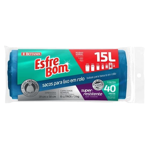 O Saco de Lixo em Rolo com Fundo Reforçado Azul 15L EsfreBom Bettanin 60 Unidades é de fácil destaque, possui fundo reforçado e é super resistente. O rolo vem com 40 unidades.