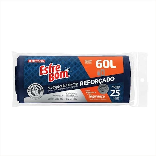 O Saco de Lixo em Rolo Reforçado Azul Petróleo 60L EsfreBom Bettanin 25 Unidades possui maior espessura, conferindo ainda mais resistência a perfurações e maior capacidade para cargas mais pesadas. O fundo também é reforçado, garantindo mais segurança. Com capacidade de 60L, cada rolo vem com 25 unidades.