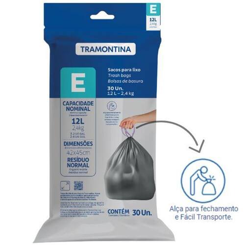 Material: plástico 100% reciclável e de alta resistência, conforme norma abnt nbr 9191: 2008. Capacidade: 12 litros / 2,4kg. Letra e . Embalagem com 30 unidades. Possui alça para fechamento e transporte. Sistema exclusivo para lixeiras tramontina. Embalagem com letra indicativa de tamanho de saco lixo, consulte o folheto na página do produto e veja quais lixeiras são compatíveis. Todas as imagens são meramente ilustrativas.