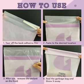 cheiros peculiares. Fácil de usar: os sacos de lixo são projetados com fita dupla face. Um lado para colar, outro para fechar a bolsa. Basta retirar a película de apoio, você pode colar em qualquer lugar que quiser. Depois de encher o lixo, retire a película adesiva da frente, feche-a e jogue-a fora. Nota: Certifique-se de que não haja poeira ou umidade onde está colado, caso contrário, ele cairá