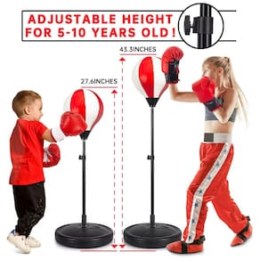 Saco de pancadas infantil ShyLizard com suporte ajustável, desenvolvido para crianças de aproximadamente 5 a 10 anos, acompanhado de 2 pares de luvas e bomba de ar para uso doméstico. O conjunto inclui bola de boxe inflável em suporte vertical, base para enchimento com água ou areia e mola resistente que permite movimentação da bola em múltiplas direções durante os golpes.?