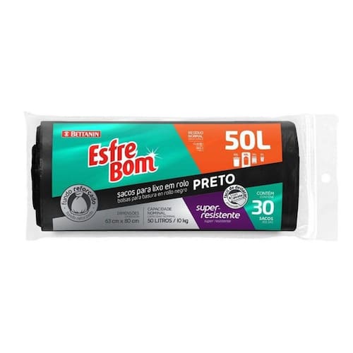 Saco Para Lixo Reforçado EsfreBom 50 Litros Preto Rolo com 30 Os Sacos para Lixo em Rolo Preto 50L da EsfreBom são super-resistentes a perfurações. O fundo é reforçado, garantindo mais segurança. Com capacidade de 50L, cada rolo vem com 30 unidades.