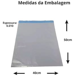 largura: 40 cm boca do envelope . Comprimento: 50 cm + 3cm de língua para fechamento aba . Quantidade: 250 unidades espessura: 0. 010 micras ótima espessura para embalar, bem resistente peso: 10 g