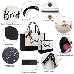 1. Tamanho e material: Material: Feito de material de lona de 368 g, durável e reutilizável. Tamanho da bolsa: 43 cm de comprimento + 32 cm de largura + 19 cm de altura, grande o suficiente para guardar tudo no dia do evento. 2. Bordado exclusivo e requintado e presente personalizado: nossa bolsa de presente personalizada tem letras pretas bordadas na frente, acabamento requintado, agulha e linha densas e boa textura. 3. Bolsa interna com zíper e alça de couro: nossa bolsa de lona tem uma bolsa interna com zíper. A bolsa com zíper facilita o armazenamento de seus pequenos itens 4. É um presente personalizado para o Dia das Mães, aniversário, Natal, ano novo, presente de Ação de Graças. - ?Alça de couro e design de unhas?: nossa bolsa de lona para noiva com alça de couro e fivela magnética. A alça de couro pode relaxar suas mãos e ombros, e não deixará sua mão estampada com marcas vermelhas. A textura da alça de couro é melhor, parece mais sofisticada, e esta bolsa Mother of The Bride está mais alinhada com as características das mulheres. O design da unha e a linha de pressão, o reforço duplo não apenas torna a alça mais forte, mas também uma tolerância mais forte. - ?A combinação de 2 bolsas?: esta bolsa de presente para chá de panela também tem uma bolsa de cosméticos independente. A combinação de bolsas grandes e pequenas pode atender melhor às suas diferentes necessidades. A bolsa grande para noivas pode ser usada para guardar seus suprimentos diários de deslocamento, como guarda-chuvas solares, óculos de sol, copos de água, etc. Tamanho da bolsa de maquiagem: 24 x 19 x 9,4 cm, durável e respirável, espaçosa o suficiente para guardar suas ferramentas de maquiagem. É uma bolsa de viagem de maquiagem funcional, bolsa organizadora de viagem de casamento e até mesmo uma bolsa. - ?Grande capacidade e durável?: 43 cm de comprimento + 32 cm de largura + 19 cm de altura. Esta bolsa de presente de chá de panela é grande o suficiente para guardar todos os seus acessórios diários, incluindo roupas, documentos, lancheiras, bebidas e lanches. e é feita de lona de algodão natural 100% resistente de 283 g com uma alça de couro reforçada. que tem o tamanho certo, a bolsa utilitária é feita com fio denso e acabamento requintado. Todas as costuras são reforçadas e costuradas para garantir sua durabilidade. - ?BORDADO E DICAS DE LAVAGEM PERFEITA?: Nossa bolsa de presente personalizada tem bordado de letras pretas na frente, acabamento requintado, agulha e linha densas e boa textura. A lona pesada por fora e por dentro tem um forro que não se molha. As bolsas femininas de praia são facilmente laváveis à mão e de longa duração. (Observação: lavagem à máquina não é recomendada.) Recomenda-se pendurar para secar. Você pode usar esta bolsa de presente reutilizável para noivas por um longo tempo. - ?Várias ocasiões e como presentes?: esta sacola de lona é uma bolsa feminina ideal para o dia do casamento na praia, festa de casamento, deslocamento, viagens, compras. Adequado para ocasiões importantes e uso diário. Particularmente, é o presente de despedida de solteira perfeito para a noiva, mãe da noiva, dama de honra, festa de chá de panela, lua de néctar das flores e dia de casamento. Além disso, a bolsa de presente com monograma pode ser presente de chá de panela, presentes de Natal, presentes de agradecimento ou presentes de aniversário para amizade feminina.