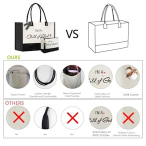 Presentes cristãos para mulheres: Nossa sacola cristã para mulheres é ótima para muitos itens, como laptops, lancheiras, toalhas, lanches, garrafas de água, roupas, arquivos etc. A sacola de presente católica é adequada para muitas ocasiões, como oração na igreja, batismo, trabalho, fim de semana. Fonte bordada requintada e presente personalizado: cada sacola cristã para mulheres é individual usando uma fonte bordada de alta densidade de fios, permitindo que você dê um toque pessoal ao seu presente. Alça de couro, botão de latão retrô e bolsa interna com zíper: nossa bolsa de presentes religiosos para mulheres tem uma alça de couro graciosa e design de botão de latão retrô. Capacidade extra grande e durável: 45 cm de largura + 32 cm de altura + reforço inferior de 19,8 cm com uma alça de lona reforçada de 61 cm. Grande o suficiente para guardar todos os seus acessórios diários, incluindo roupas, documentos, lancheiras, bebidas e lanches. A bolsa de presente baseada na fé para mulheres é feita de lona resistente 100% de 368 g. Os pontos duplos tornam a bolsa feminina forte o suficiente para guardar muitos itens sem quebrar. O botão de metal na parte da junta torna as alças longas suficientemente fortes. Alças de ombro longas se ajustam ao conforto do seu ombro. Lavar à mão e reutilizável: nossa sacola cristã é feita de lona 100% natural de 368,5 g. A lona pesada por fora e por dentro tem um forro que não se molha. A sacola católica é facilmente lavável à mão e de longa duração. (Observação: lavagem à máquina não é recomendada.) As sacolas reutilizáveis também podem ajudar você a reduzir seu impacto no meio ambiente. - Presentes cristãos para mulheres: Nossas bolsas femininas são ótimas para muitos itens, como laptops, lancheiras, toalhas, lanches, garrafas de água, roupas, arquivos etc. Estas sacolas de presentes religiosos para mulheres são adequadas para muitas ocasiões, como oração na igreja, batismo, chá de panela, trabalho, fim de semana, biblioteca, compras de supermercado. - Alça de couro, botão de latão retrô, fita de bolinhas e bolsa interna com zíper: nossas sacolas cristãs têm alça de couro graciosa e design de botão de latão retrô. A bolsa com zíper facilita o armazenamento de seus pequenos itens importantes, como telefones, chaves e óculos, e fácil acesso. Além disso, tem outros dois bolsos para você organizar seus itens de forma mais organizada e guardar seus pertences de forma mais eficaz. O rodapé faz com que a bolsa mantenha sua forma e fique sobre a mesa. - Fonte bordada requintada e presente cristão personalizado: "Eu sou um filho de Deus". O design de bordado exclusivo e as palavras inspiradoras da sacola de presentes religiosos, fazendo com que a pessoa que a recebe se sinta quente, confiante no futuro e cheia de força! Este é um excelente presente cristão para familiares, amigos e senhoras. - Capacidade extra grande e durável: 45 cm de largura + 32 cm de altura + reforço inferior de 19,8 cm com uma alça de lona reforçada de 61 cm. Grande o suficiente para guardar todos os seus acessórios diários. As bolsas de presente cristãs personalizadas para mulheres são feitas de lona resistente 100% de 368 g. Os pontos duplos tornam a bolsa de presente católica feminina forte o suficiente para guardar muitos itens sem quebrar. O botão de metal na parte da junta torna as alças longas suficientemente fortes. Alças de ombro longas se ajustam ao conforto do seu ombro. - Combinação perfeita de bolsa cosmética: esta bolsa de presente religiosa inspiradora para mulheres também tem uma bolsa cosmética independente, pode atender melhor às suas diferentes necessidades. A sacola feminina cristã e a bolsa de cosméticos são feitas de lona 100% natural de 368 g. A sacola de presente cristão para mulheres é facilmente lavável à mão e de longa duração. (Observação: lavagem à máquina não é recomendada.) As sacolas reutilizáveis também podem ajudar você a reduzir seu impacto no meio ambiente.