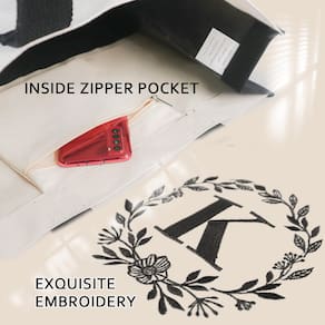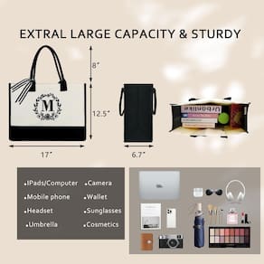Classic Monogram Embroidery Font & Personalized Gifts: Each Monogrammed initial tote bag is individual using a high thread density monogram in a classic black font. Allowing you to give your personalized gift a personal touch.So the monogram tote bags could be great for her mom gift, sisters gift, hostess gifts, employee gifts, 30th 40th 50th 60th 70th birthday gifts for her, maid of honor proposal gifts, mother in law gifts, godmother gift, bridesmaid gifts for wedding day, top christmas gifts, teacher tote bag, bride bag, hostess gift, friend gift. Also, the personalized gifts bag can be an adorable way to thank your teacher, bridesmaids, maid of honor, mother of the bride/groom, guests on wedding day. Inner Zipper Pouch & Long Handles with Ribbon: Our large personalized tote bag has an inner zipper pouch. The zipper pouch of our teacher gifts tote makes it easy to store phone, keys. Long handles of our teacher gifts tote allow for putting on the shoulder or carry in your hand. Large capacity & sturdy: 17" x 12.5" x 6.7". Our women gifts tote bag has a 24" reinforced canvas handle. Large enough to hold all your daily accessories. The large beach bag is made of heavy duty 100% 13oz natural canvas. The double stitches make our cute canvas tote bag strong enough to hold many items without broken. The 'X' stitches on the joint part make the long handles strong enough. Multi Occasions: Our personalized gifts tote bag for women is great for many items, like laptop. The personalized canvas bag is suitable for many occasions. Such as beach bag, work tote bag, teacher bag, wedding gift, bridal shower gift,coworkers retirement gifts ,mom gifts, hostess gifts,women birthday gifts, 50th birthday gifts for her, 60th birthday gifts for women, 40th birthday gifts women, 70th birthday gifts for women, 30th birthday gifts for her, Mother's Day gifts, Valentine'S Day Gifts,Teacher's Day gifts,boss gifts, travel bag,etc. - Monogram Embroidery Font & Personalized Gifts:Our personalized gifts bag is using a high thread density monogram in a classic font. Allowing to give Gift a personal touch. The canvas tote bag could be as a cool gifts. Such as mom gifts bags, teachers gifts bag, friend gifts, maid of honor proposal gifts, mother in law gifts, godmother gift, coworker gifts, bride gifts, sister gifts, hostess gifts, friends gift, 30th 40th 50th 60th 70th birthday gifts for women. - Inner Zipper Pouch & Long Handles with Ribbon: Our initial tote bags have an inner zipper pouch. The zipper pouch makes it easy to store small items. The handles of our birthday gift bag are tied with ribbon. Long handles of the unique beach bag allow for putting on the shoulder or carry in your hand. It is large beach bag, work bags, travel tote bags, teachers bag, mom presents. The large monogrammed tote bags can be an cool gifts for elderly women,such as fun inspirational gifts for grandma. - Large capacity & Sturdy: Our personalized gift baskets is 17 inch wide, 12.5 inch tall, 6.7 inch bottom gusset with a 24 inch reinforced canvas handle. Large enough to hold all your daily accessories. The double stitches make our canvas women gifts bag strong enough to hold many items without broken. The 'X' stitches on the joint part make the long handles strong enough. Our beach bag is cool customized office gifts for coworkers and last minute gifts, or young women gift ideas. - Multi Purpose & Multi Occasions: Our personalized gift baskets empty is great for many items, like laptop. The personalized canvas bag is suitable for many occasions. Such as beach bag, work gifts for coworker, teacher bag, wedding gifts, birthday gifts for women, coworkers gifts, mom presents, hostess gift ideas, bride gifts, bride to be gifts, gifts for elderly women, gift baskets for women, gifts for sister, friend gifts for women, Mother's Day gifts, Teacher's Day gifts, travel tote bags. - Hand Wash & Reusable:Our personalized bags for women are made of 100% 13oz natural cotton canvas. Heavy canvas on the outside, and a moisture resistant lined interior. The monogrammed beach tote bags are easily hand-washable and long lasting. You can use this initial tote bags for long time and it can also help you to reduce your impact on the environment. (Note: machine wash is not suggested.)