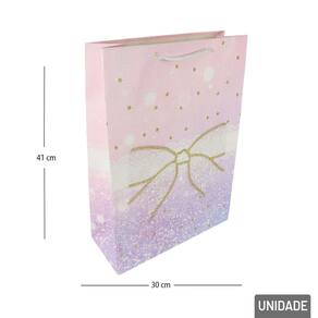 Sacola de Papel 41,5x30cm Laço com Glitter C Leve suas compras ou presentes de forma elegante com esta Sacola de Papel encantadora! Medindo 41,5x30cm, ela é perfeita para ocasiões especiais, como aniversários, casamentos ou até mesmo para um dia de compras.\nO design de Laço, adornado com Glitter, traz um toque de sofisticação e charme, tornando cada detalhe ainda mais especial. Cada Sacola é uma verdadeira obra de arte, ideal para surpreender quem você ama. Feita de Papel de alta qualidade, esta Sacola é resistente e pode suportar itens pesados com facilidade, garantindo que seus produtos cheguem ao destino em segurança. Com alças trançadas são confortáveis, é prática e fácil de transportar.\nDisponível em cores e modelos . Informação Adicional Marca : TINGS Tipo de material : Papel Cores ou Estampa : Color Dimensões do Produto : 41,5 X 30 X 12 CM Dimensões da Embalagem : 41,5 X 30 X 0,5 CM Peso Bruto (Gramas) : 0.104
