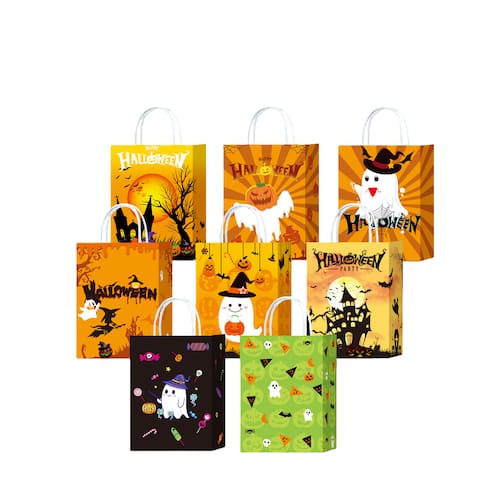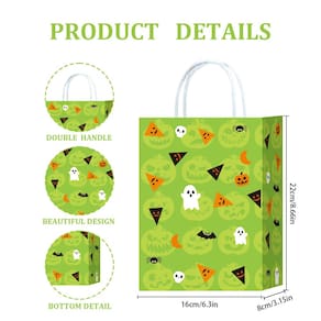 Material: papel kraft; tamanho: 22* 16* 8 cm; peso: 17 g; quantidade: 10 unidades. Construção Kraft resistente — Feito de papel kraft grosso que resiste a rasgos e mantém a forma, ideal para lembrancinhas, guloseimas ou compras leves. Arte vibrante de Halloween — apresenta 10 designs festivos variados, incluindo fantasmas, abóboras, bruxas, casas mal-assombradas, motivos de doces e cenas de outono. Alças de transporte confortáveis — Inclui alças torcidas fortes para um transporte suave e fácil, adequadas para adultos e crianças. Tamanho médio de 22 × 16 × 8 cm — Oferece amplo espaço para lanches, brinquedos, acessórios, pequenos presentes ou guloseimas de festa, além de ser fácil de transportar. Conjunto versátil de 10 pacotes — perfeito para festas de Halloween, eventos escolares, atividades de doces ou travessuras, reuniões comunitárias ou decorações temáticas.