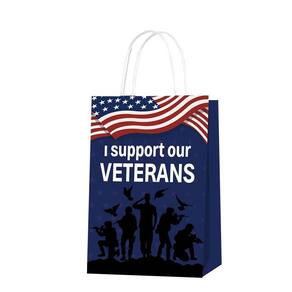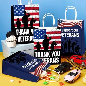 Material: papel kraft; tamanho: 22* 16* 8 cm; peso: 17 g; quantidade: 10 unidades. Material de papel kraft premium Feita de papel kraft resistente, esta bolsa de transporte oferece resistência confiável e uma textura limpa, adequada para guardar itens pequenos, acessórios, documentos ou suprimentos para eventos. Design do tema de agradecimento aos veteranos Impresso com uma mensagem respeitosa de “Obrigado aos veteranos”, o design transmite honra e gratidão, tornando-o adequado para eventos comemorativos e atividades de agradecimento. Construção confortável da alça