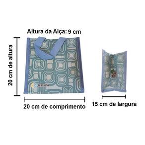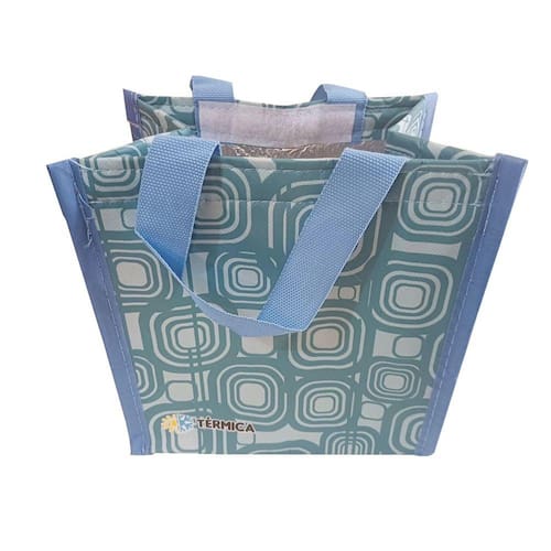 Sacola térmica (marmitérmica) confeccionada em fibra de ráfia com interior aluminizado, alça para as mãos em nylon. Sua utilização é indicada para transporte de marmitas pequenas (quentinhas) de até 18 cm de comprimento x 13 centímetros de largura x 10 centímetro de altura;