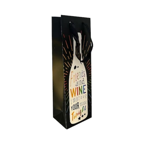 Sacola para Garrafa de Vinho e Champanhe – Friends and Wine Descontraída e encantadora, a Sacola para Garrafa de Vinho e Champanhe – Friends and Wine traz a mensagem “Friends and wine improve your mood tonight” (Amigos e vinho melhoram seu humor esta noite), celebrando os bons momentos com leveza e afeto. Perfeita para encontros entre amigos, festas informais, aniversários descontraídos ou lembranças divertidas, essa sacola transmite espontaneidade e alegria. Confeccionada com material resistente e visual colorido, ela protege e valoriza a garrafa com estilo jovem e vibrante. As alças confortáveis completam a experiência prática e charmosa. Seu formato (36 x 12 x 9 cm) é compatível com a maioria das garrafas de vinho e espumante. Uma forma leve e afetuosa de presentear quem faz parte dos seus melhores brindes. Ean: 7899785548516