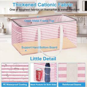 - ?Reinforced Design?Grocery tote bag metal wire frame on the open top so it stays open and the sides are rigid it is light to carry and very long-lasting. The reusable grocery bags up for easy loading and unloading. the totes are made from thick polyester, the interior features pe waterproof coating provides an excellent waterproof performance to keep stored items dry, it is lightweight yet long-lasting for grocery , shopping, luggage, picnics, and storage