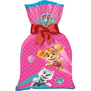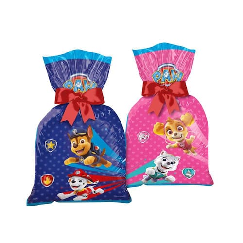Conjunto com 12 sacolas plásticas temáticas da Patrulha Canina, ideais para presentear os participantes da festa.