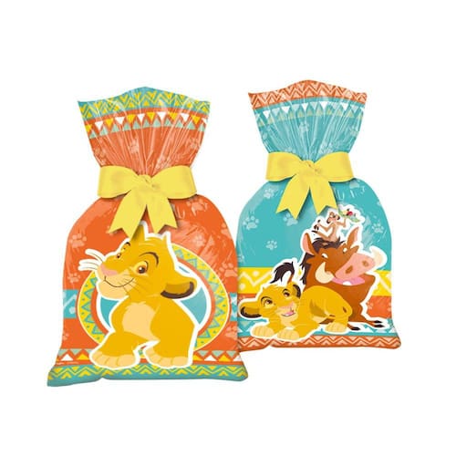 Conjunto com 12 sacolas temáticas do Rei Leão para presentes e lembrancinhas.