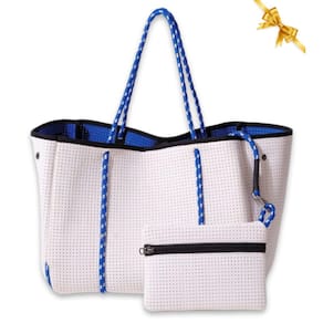 - A razão por trás do azul branco: uma bolsa branca é sempre uma declaração chique. Com alças azuis e interior, "white blues" faz uma declaração casual e náutica.
