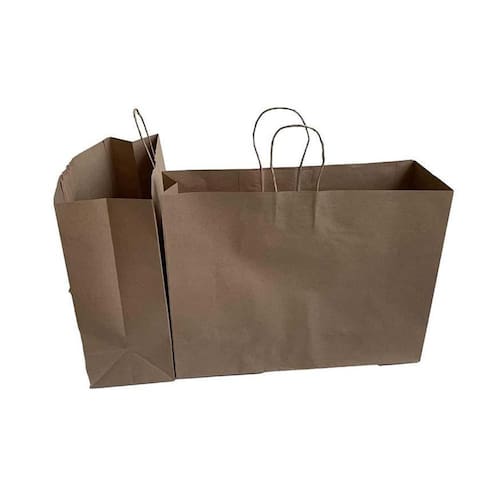 Produzidas com papel kraft 150 gramas, lisas, feitas a mão, com reforço no fundo, nas medidas 40x13x30 centímetros, alça de papel kraft torcido colada, acondicionadas em pacotes de 50 unidades. Marca: Não Informado