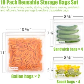 - Multiuso: os sacos reutilizáveis de 1 galão (28 cm x 27,9 cm x 10 9/40.6 cm) são ótimos para marinar carnes, alimentos congelados, cereais, biscoitos, materiais de tricô, material de escritório. Os sacos de sanduíche reutilizáveis têm 21 x 19 cm e os sacos de lanche reutilizáveis têm 21 x 14 cm, são o recipiente perfeito para sanduíches, lanches, almoço, legumes, frutas, alimentos para bebês, cosméticos, maquiagem de joias, artigos de papelaria, viagens e muito mais. O design transparente permite uma rápida olhada no conteúdo interno