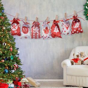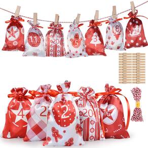 Material: Tamanho do tecido: bolsa de 10* 14 cm Peso: 132g/Quantidade do pacote: 24 sacos+24 clipes +1 rolo de corda Tecido acetinado liso: feito de tecido macio com acabamento sedoso, leve e durável para uso sazonal e decorativo. Números da contagem regressiva do advento: o design numerado de 1 a 24 oferece uma divertida experiência diária de contagem regressiva durante a época festiva. Estilo de fechamento com cordão: a abertura na parte superior mantém o conteúdo seguro, permitindo fácil preenchimento e acesso rápido. Acessórios de suspensão completos: incluem clipes correspondentes e uma corda vermelha para exibição flexível em paredes, cornijas, janelas ou trilhos de escada. Uso festivo em várias cenas: opção de sacola de presente ideal para doces, notas, surpresas, atividades em sala de aula ou detalhes de mesa natalinos.