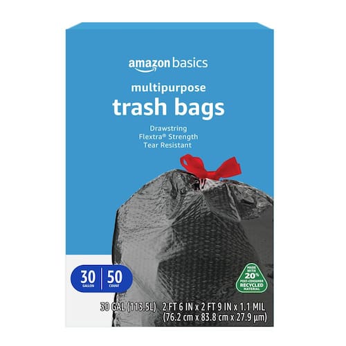 Amazon Basics Flextra Sacos de lixo multiuso com cordão, 20% de conteúdo reciclado pós-consumo, 30 galões, 50 unidades, pacote com 1