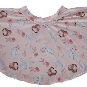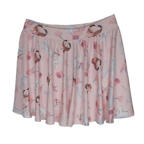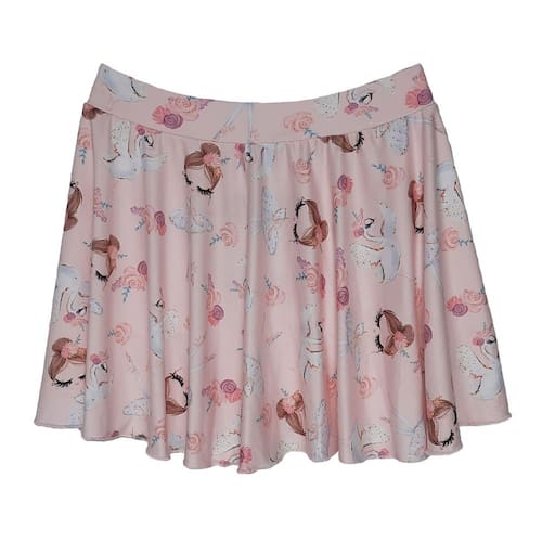 A Saia Gode Estampada Infantil é produzida em estilo gode que deixa umas curvas no tecido dando mais beleza durante a dança. Possui estampa de bailarina.