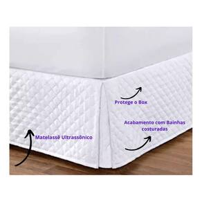 Saia Cama Box Queen Matelasse Ultrassonico forro e babado Cor da Saia Matelada: Branca Transforme Seu Quarto com Elegância e Conforto Apresentamos a Saia de Casal Matelada Ultrassonicamente, a solução perfeita para quem busca unir beleza e funcionalidade no quarto. Com medidas de 1,58m x 1,98m x 0,30m, esta saia foi especialmente desenvolvida para camas box e box baú, garantindo um ajuste impecável e sofisticado. Características que Encantam: Confeccionada em Microfibra de Alta Qualidade: Material macio e durável, que oferece um toque suave e aconchegante. Forro que Protege Seu Colchão: Um forro cuidadosamente elaborado para cobrir toda a superfície do colchão, proporcionando proteção extra contra poeira e desgaste. Babado Matelado: Detalhe que enriquece o visual do seu quarto, adicionando um toque de elegância e charme à decoração. Facilidade de Uso: Instalação prática e rápida, transformando o seu ambiente em instantes. Benefícios Incomparáveis: