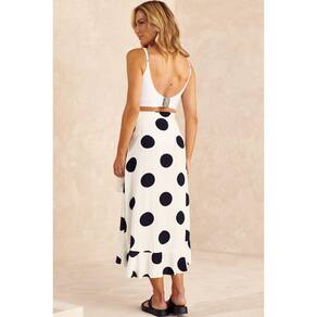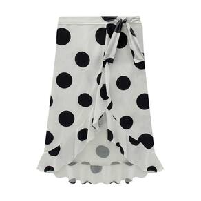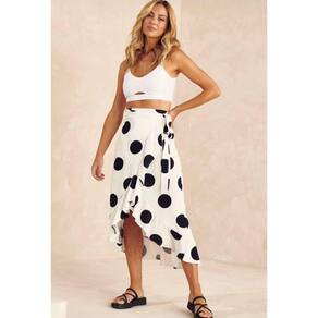 Saia saída de praia, midi com cintura alta. Transpasse frontal com babado na barra. Faixa na cintura para fazer amarração. Em tecido de viscose em estampa exclusiva.