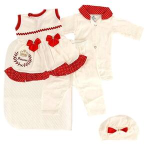 Conjunto de Roupa de Luxo Bege e Vermelho com 5 peças, é uma excelente escolha para o seu bebê, com um acabamento de ótima qualidade e super lindo, ideal para a sua princesinha Nosso enxoval é totalmente diferente do que você já viu, contendo uma touquinha de bichinho, um coletinho com touca, um body com bordado de girafinha e uma calça, para deixar sua filha confortável e super linda