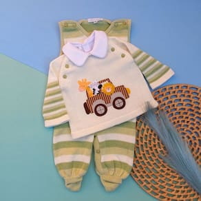 Conjunto Bebê em Tricô Casaco Salopete e Manta Acompanha1 Casaco1 Salopete1 Manta