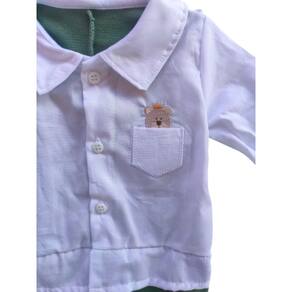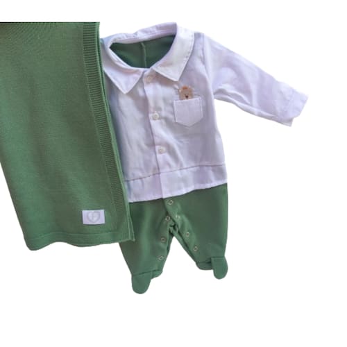 Saída maternidade masculino confeccionada a frente da camisa em tecido 100% algodão com bordado de alta qualidade no bolsinho decorativo frontal fechamento em botões restante do macacão e manta em linha acrilica (tricô). Peças inclusas Macação manga longa e manta.