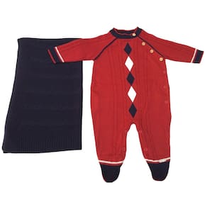 Kit Saida de maternidade maravilhoso, 2 peças: macacão vermelho + manta azul marinho no tricot 100% acrílico. Um luxo. Noruega é tudo de bom!! Perfeito para deixar seu bebê ainda mais lindo. Coleção inspirada em cores e materiais do Brasil e Europa.Tudo pensado e desenvolvido com muito carinho.