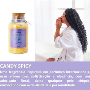 Sais de banho candy spicy 360g para banheira hidro ofurô spa relaxante hidromassagem Sais de banho candy spice - 360 ml ========= Uma fragrância inspirada em perfumes internacionais, esse aroma traz sofisticação e elegância, com um adocicado floral, deixa qualquer pele chique, envolvendo com exclusividade e personalidade. ========= Pirâmide olfativa Cabeça: pera, cassis, mandarina; coco e bergamota, grapefruit, pimenta rosa, accord whisky, pêssego e gálbano. Corpo: íris, jasmim, flor de laranjeira; notas florais, lavanda, sândalo, cardamomo, canela da índia, violeta e ylang ylang. Fundo: pralinê, baunilha, patchouly, fava tonka, caramelo, chocolate, lábdano, madeira de carvalho, cedro e sândalo. ========= Como utilizar nossos produtos em seu dia a dia os sais de banho são na banheira para relaxar, aliviar o , desintoxicar o corpo e melhorar a circulação sanguínea. Eles podem ser para deixar a pele radiante, aliviar o peso das pernas, perfumar o corpo e até desintoxicar ========= Modo de uso: Em uma banheira seca e desligada, tampe o ralo, e despeje um pouco de sais de banho no fundo da banheira. Depois ligue a torneira e deixe escorrer a água até encher a banheira, dessa forma caso não tenha hidromassagem, a própria água fará a espuma desejada . Quando a água chegar no limite da banheira, ligue a hidromassagem. Assim com o movimento da água fara mais espuma na sua banheira. Cada pote de 360ml, você utiliza para 3 banhos. Sendo aproximadamente 120ml por banho.