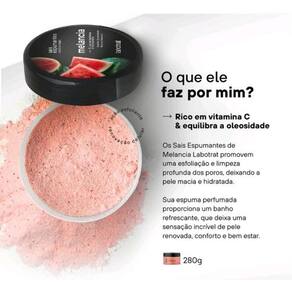 Sais Espumantes Melancia Dia A Dia 280Gr - Labotratn Os Sais Espumantes Caju Labotrat, promove uma esfoliação e limpeza profunda dos poros, deixando a pele muito mais macia e hidratada. Sua espuma perfumada proporciona um banho refrescante, que deixa uma sensação incrível de pele renovada, conforto e bem estar. Os Sais ainda proporcionam propriedades antioxidantes, removem células mortas e podem ser utilizados no chuveiro e na banheira. Marca: Não Informado