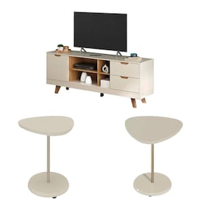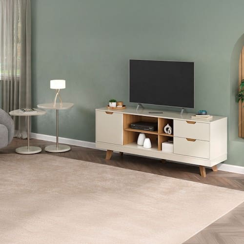O(a) Sala Completa para TV Até 60" Isa 1 Porta 2 Gavetas com 2 Mesas de Apoio Off White/Carvalho - Pnr Móveis é produzido em MDF e MDP na escala de brilho Fosca com Textura, e possui um grau de dificuldade de montagem: Médio.