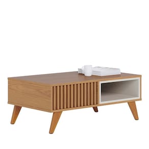 Mesa de Centro Jeri Ripada - Colibri Estrutura em MDF e MDP Pintura UV Nichos internos em cada lado Detalhe ripado na lateral Pode ser usada de ambos os lados Pés em madeira maciça Design estilo retrô e simétrico Suporta até 8 Kg