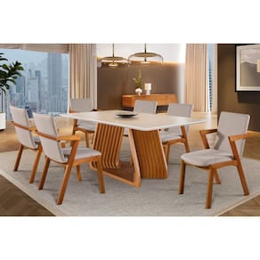 Sala de Jantar com Vidro Madeira Maciça 6 Cadeiras 1,80x0,90m - Obisidiana - Harmonia Salas A mesa de jantar Obsidiana é um móvel ideal para sua casa, com design moderno e elegante, que vai agregar a sua decoração tornando sua sala de jantar mais aconchegante! Ela tem uma base super estilosa e moderna com um design diferenciado que é um arraso. Esse modelo tem a base em madeira maciça de Eucalipto e o tampo em MDF laminado, garantindo uma mesa resistente e duradoutra. Essa elegante cadeira de jantar combina sofisticação e conforto em um design atemporal. Fabricada em madeira maciça de alta qualidade, possui estrutura robusta e acabamento refinado em tom natural, valorizando a beleza da madeira. O encosto e assento estofados com espuma D-23 garantem o conforto e aconchego para você, seus amigos e familia trazendo uma experiência agradável durante as refeições. Ideal para compor salas de jantar sofisticadas, áreas gourmet ou espaços de convivência, essa cadeira une durabilidade, ergonomia e um design versátil que harmoniza com diversos estilos de decoração. Devido à fabricação manual, o que compete ao produto um acabamento impecável, o tempo solicitado é um pouco maior do que o convencional por isso pedimos um prazo um pouco maior do que a maioria dos produtos. No entanto, garantimos que o resultado vale a pena. Faz parte do anúncio: 1 Mesa de Jantar Obsidiana com Vidro 1,80x0,90m 6 Cadeiras Tulipa Obs.: Objetos de decoração não acompanham o produto. Particularidades da Sala de Jantar: Características da Mesa: - Base em madeira maciça de Eucalipto; - Tampo em MDF laminado; - Tampo quadrada; - Acabamento em verniz PU semi-fosco; - Madeira tratada e seca em estufa; - Design moderno, sofisticado e diferenciado; - Madeira Ecologicamente Correta; - Baseado em conceitos sustentáveis; Dimensões da Mesa: Altura: 78 centímetros Largura: 1,80 metros Profundidade: 0,90 centímetros Características da Cadeira: - Madeira Maciça de Eucalipto seca e tratada em estufa; - Madeira imunizada; - Espuma D-23; - Estrutura reforçada; - Ecologicamente correta; - Peso suportado recomendado 150kg. Dimensões da Cadeira: Altura: 88 centímetros Altura do assento: 45 centímetros Largura: 49 centímetros Profundidade: 52 centímetros Informações Importantes: - Produtos podem apresentar diferenças de tonalidades entre a foto na tela e o produto real, devido a calibração de cor de tela. - Limpar com flanela ou pano macio. Não utilizar álcool. Não utilizar produtos abrasivos ou corrosivos - Nós prezamos pela qualidade da entrega em primeiro lugar, trabalhamos com transportadoras altamente selecionadas e os melhores materiais de embalagem. - As cadeiras vão 100% montadas nas caixas e embaladas. Não necessita da montagem de um profissional. - Objetos de decoração não incluso. - Certifique-se de que o produto caiba em elevadores e vãos de escadas, não fazemos içamentos ou desmontagens de produtos. Quaisquer despesas deste tipo ficam a cargo do cliente - Garantia de 3 meses contra defeitos de fabricação. Marca: Não Informado