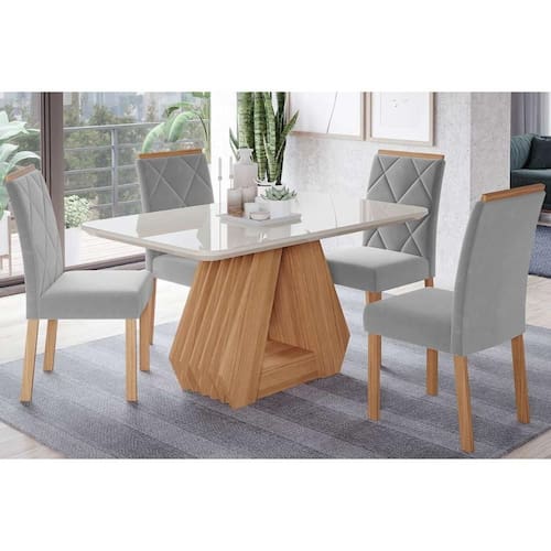 Sala de Jantar Completa Ágata Tampo Madeirado c/ Vidro 130x80cm e 4 Cadeiras Fernanda Madeirado/Linho Grafite - Cimol - Cinza