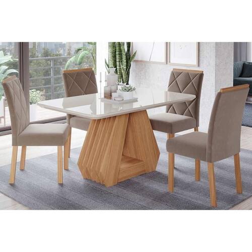 Sala de Jantar Completa Ágata Tampo Madeirado c/ Vidro 130x80cm e 4 Cadeiras Fernanda Madeirado/Suede Joli Capuccino - Cimol