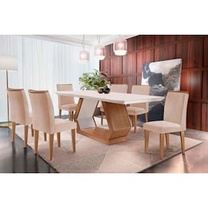 Sala de Jantar Completa Alvorada c/ Tampo Madeirado Canto Reto 180x90cm e 6 Cadeiras Amsterdã Imbuia/Off White - Suede Creme - Rufato - Blush