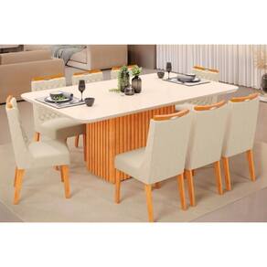 Sala De Jantar Completa Canes Tampo Madeirado C/ Vidro Curvo 200x100cm E 8 Cadeiras Bia Cedro/off White - Linho Neve - Dj Móveis