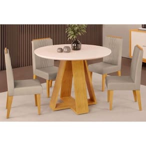 Abaixo segue os produtos do KIT: Sala de Jantar Completa Celeste Tampo Madeirado c/ Vidro Redondo 103x103cm e 4 Cadeiras Lia Cedro/Off White - Suede Kraft - DJ Móveis