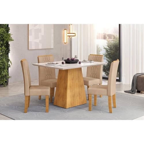 Sala de Jantar Completa Dulce c/ Tampo Madeirado c/ Vidro Reto 120x90cm e 4 Cadeiras Zoe Cedro/Off White - Suede Creme - DJ Móveis