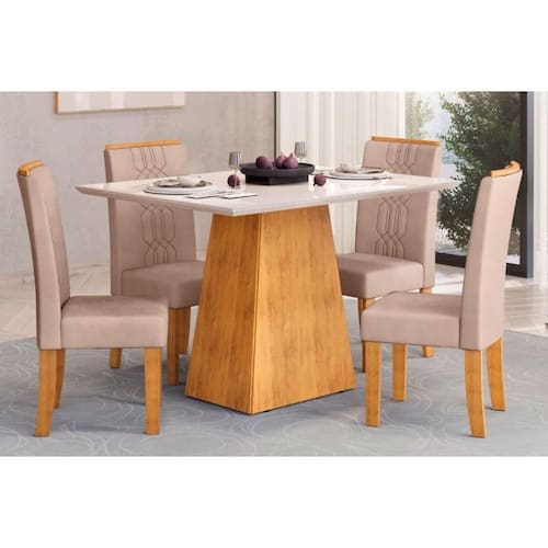 Abaixo segue os produtos do KIT: Sala de Jantar Completa Dulce Tampo Madeirado c/ Vidro Reto 120x90cm e 4 Cadeiras Zoe Cedro/Off White - Suede Creme - DJ Móveis