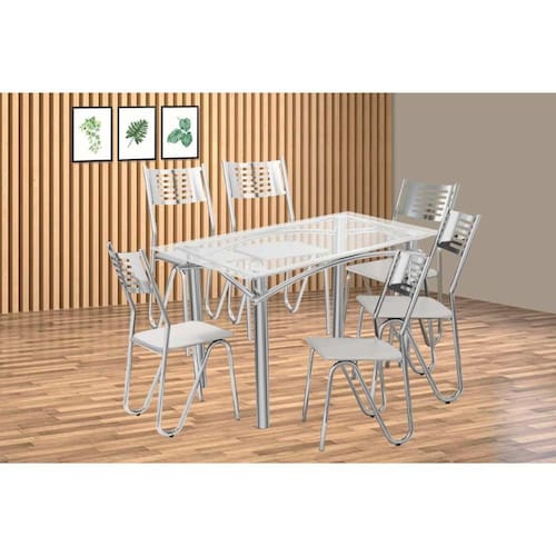 Sala de Jantar Completa Elba c/ Tampo de Vidro 120cm e 6 Cadeiras Nápoles Cromada - Courano Branco - Kappesberg Abaixo segue os produtos do KIT: Sala de Jantar Completa Elba c/ Tampo de Vidro 120cm e 6 Cadeiras Nápoles Cromada - Courano Branco - Kappesberg