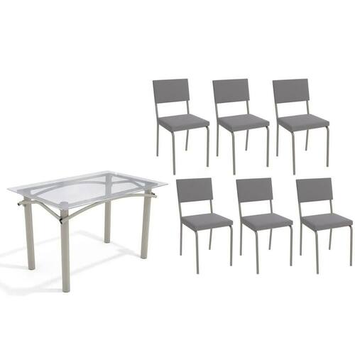 Sala De Jantar Completa Elba C/ Tampo De Vidro 120cm E 6 Cadeiras Zaria Niquel - Suede Cinza - Kappesberg