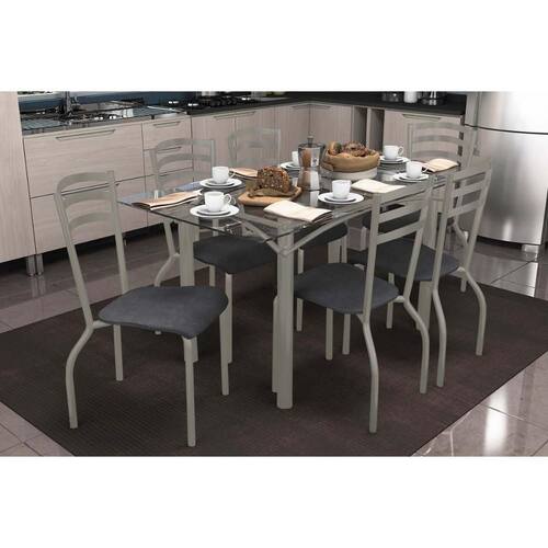 Sala de Jantar Completa Elba c/ Tampo de Vidro 150cm e 6 Cadeiras Portugal Niquel - Courano Preto - Kappesberg Abaixo segue os produtos do KIT: Sala de Jantar Completa Elba c/ Tampo de Vidro 150cm e 6 Cadeiras Portugal Niquel - Courano Preto - Kappesberg
