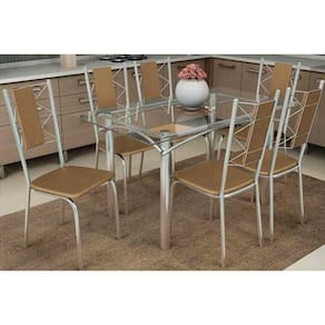 Abaixo segue os produtos do KIT: Sala de Jantar Completa Elba c/ Tampo de Vidro 140cm e 6 Cadeiras Lisboa Cromada - Courano Capuccino - Kappesberg