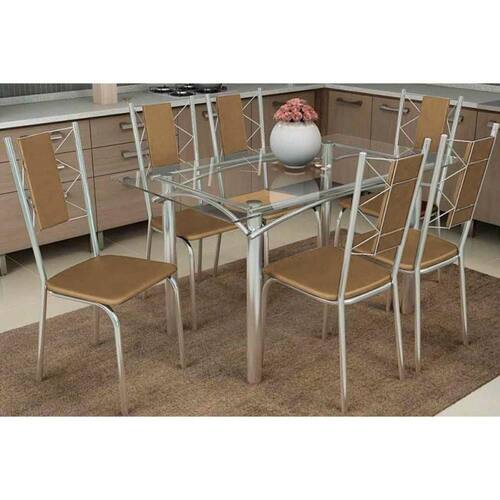 Sala de Jantar Completa Elba c/ Tampo de Vidro 140cm e 6 Cadeiras Lisboa Cromada - Courano Capuccino - Kappesberg